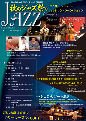 9/4月の15:00にメルマガ(2013年9月号訂正版)を配信いたしました。■■■■■■■■■■■■■■■■■■■■■■■■■■ 《お詫びと訂正》 越後湯沢秋のジャズ祭りにつきまして記載漏れがございました。 お詫び申し上げますとともに、下記の通り、追加させて戴きました。 「【日付】10月26(土)27(日)」 ■■■■■■■■■■■■■■■■■■■■■■■■■■ 資料館、メルマガ会員は、昔のアドレスを参考にしています。 アドレスが変わっていて、届かない場合等がございましたら、 お手数ですが、コチラから、ご連絡ください。 http://www.miyanoue.net/cgi-bin/melma/melma.html ※迷惑メール、スパムメールになっている可能性もございますので、 確認上、ご連絡ください。 メルマガは、下記、メールアドレスからの配信となります。 mfc@mm.miyanoue.net もちろん、新会員もどしどし募集中! http://www.miyanoue.net/cgi-bin/melma/melma.html 2013/09/03(Tue) 00:50:38 [ No.2074 ] ◆10/26土〜27日 越後湯沢秋のジャズ祭り20131年で一番楽しいイベントと言っても過言ではありません。 皆さんの参加を心からお待ちしています。 【日付】10月26(土)27(日)」 【場所】 例年通り、ホテルシェラリゾート湯沢を借り切って行います。 http://yuzawa.sierra.ne.jp/ 【出演】 ♪宮之上貴昭スーパークインテット 宮之上貴昭(g) 岡 淳(ts & fl) 吉岡秀晃(p) 清水昭好(b) 井川 晃(ds) ♪RE-REX(レレックス) 中川卓也(g,b) 梅田玲奈(p) 野呂尚史(ds) ♪スーパーギターバトル 若杉富雄 中根一城 上杉岳夫 宮之上貴昭 以上(g) 【ジャズ・ジャムセッション】 夜中3時まで行われるミッドナイトジャズ・ジャムセッションもあります。 楽器をされる方は是非参加してください。 毎年100名を大きく上回る参加者で賑わっています。 今年は100名で締め切らせていただきますのでお申し込みは是非お早めに! 【費用】 ¥17,000 ※1泊2食(夕食は豪華なコースディナーです。) 全てのライブチャージとジャズ・ジャムセッション参加費、温泉入湯税を含む。 【申し込み方法】 (1)以下の口座に内金¥5,000をお振込みください。 みずほ銀行 国分寺支店 普通 1193303 ミヤノウエ ヨシアキ または 郵便口座 00100−4−713816 スモーキン・ファンクラブ ※「越後湯沢内金振込みしました」とメールいただければスムーズです。 jazz@miyanoue.net (郵便口座にお振込みの場合は振込用紙に直接書き込んでください) (2)当日に残金を徴収いたします。 ※当日1週間以内のキャンセルは返金いたしません。 詳しくはこちら http://xn--ockwarq8rrb5c.com/ 2013/09/03(Tue) 10:38:14 [ No.2075 ] |